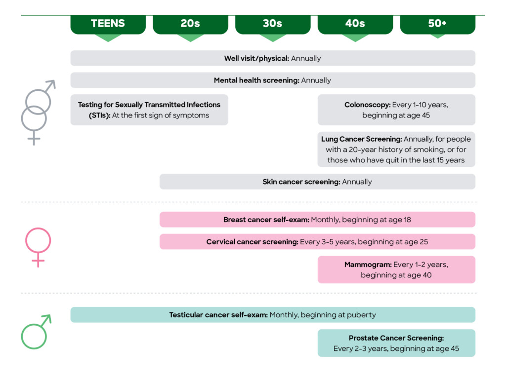 The best way to advocate for your health, and to encourage your family members to do the same, is to learn which screenings you need at various points in your life. The chart below provides some general guidelines. As always, check with your doctor to determine the right next steps for you.